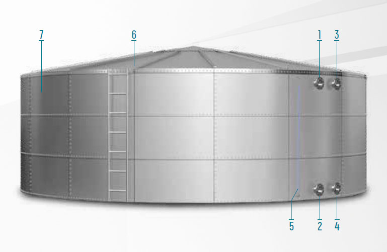 1- Su Giriş Ağzı 2- Su Çıkış Ağzı 3- Taşma Ağzı 4- Boşaltma Ağzı 5- Seviye Göstergesi 6- Üst Bakım Kapağı 7- Modül Plaka